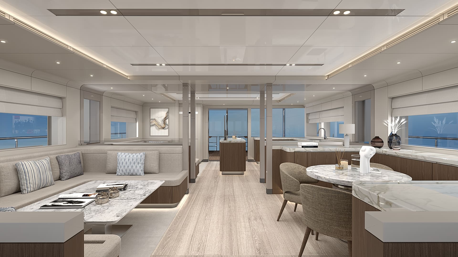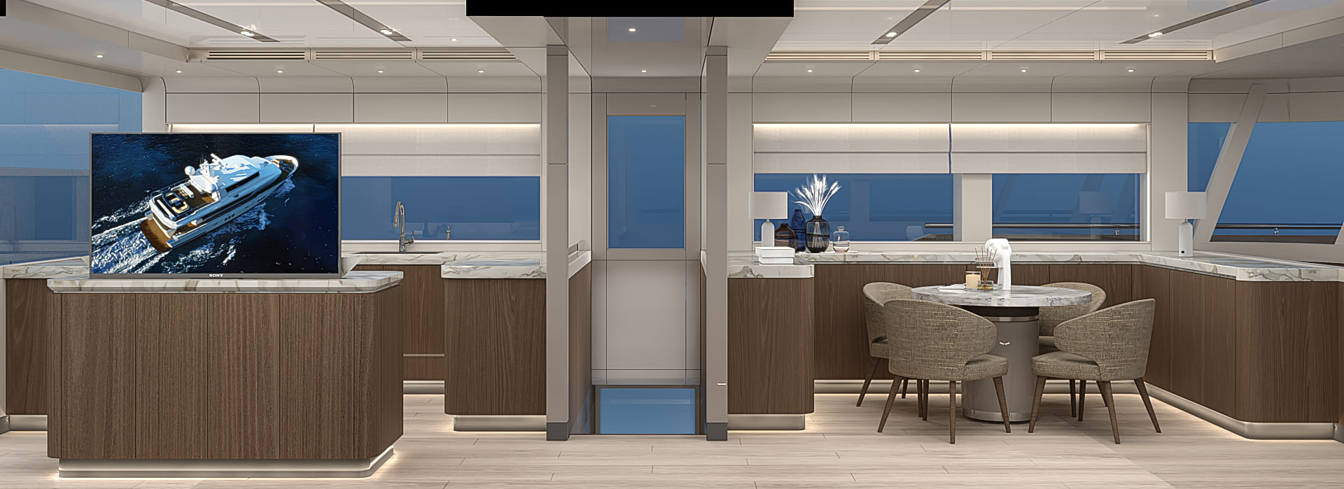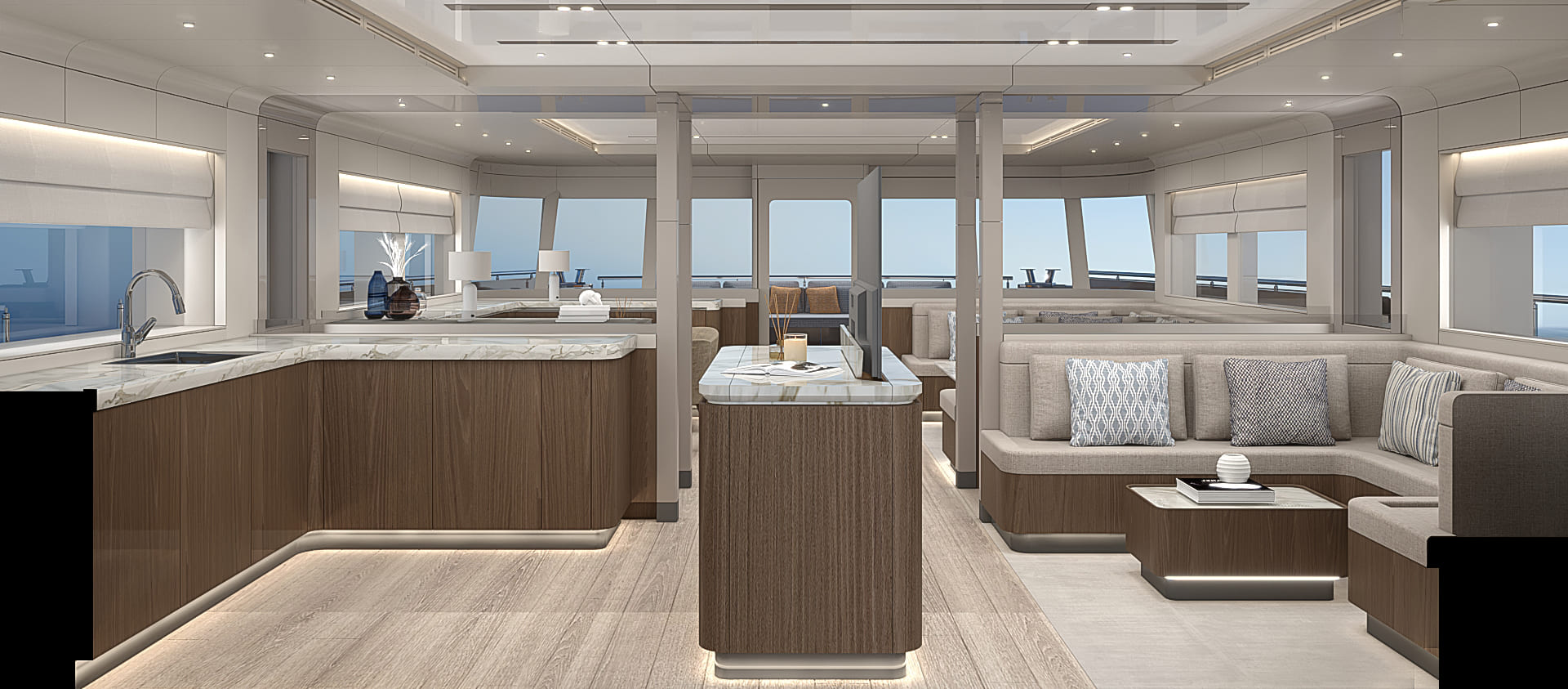 The Bering BC70 multiple outdoor living areas designed to maximize your connection with the surrounding environment. The expansive flybridge provides a perfect platform for enjoying breathtaking views, sunbathing, or simply unwinding under the open sky. This open and inviting layout facilitates seamless indoor-outdoor living, encouraging you to embrace the beauty of the sea. The thoughtfully designed galley, complete with large panoramic windows, allows you to enjoy breathtaking views even while preparing meals.