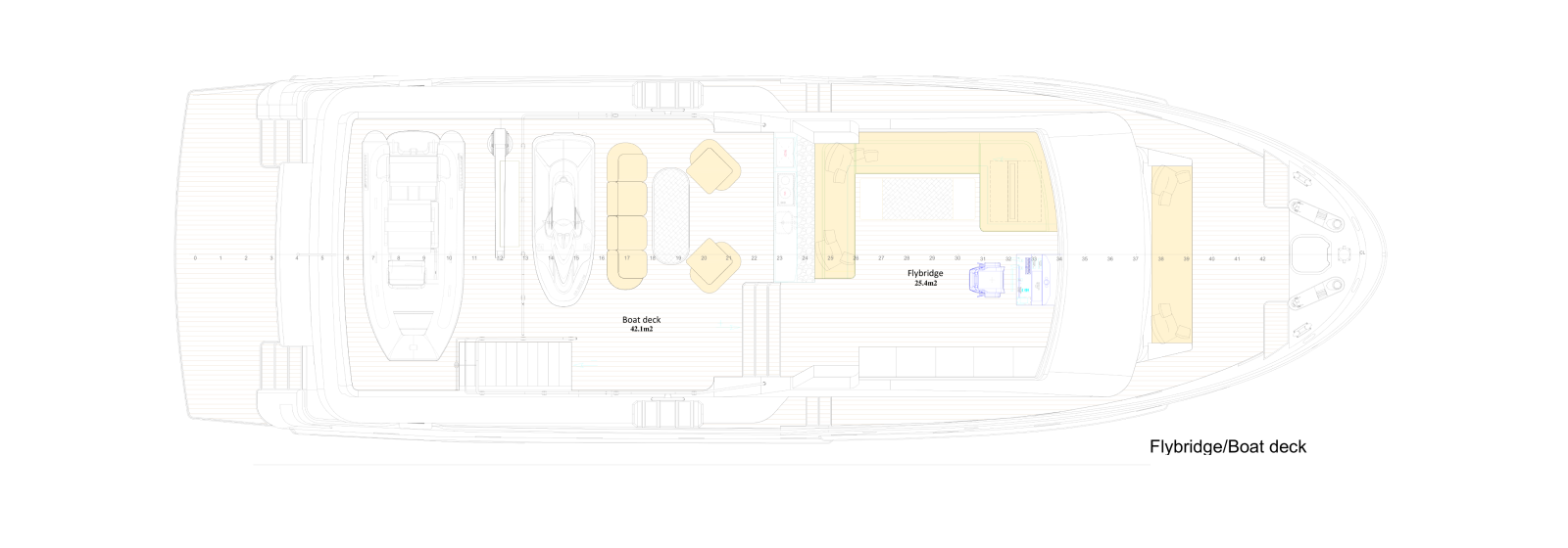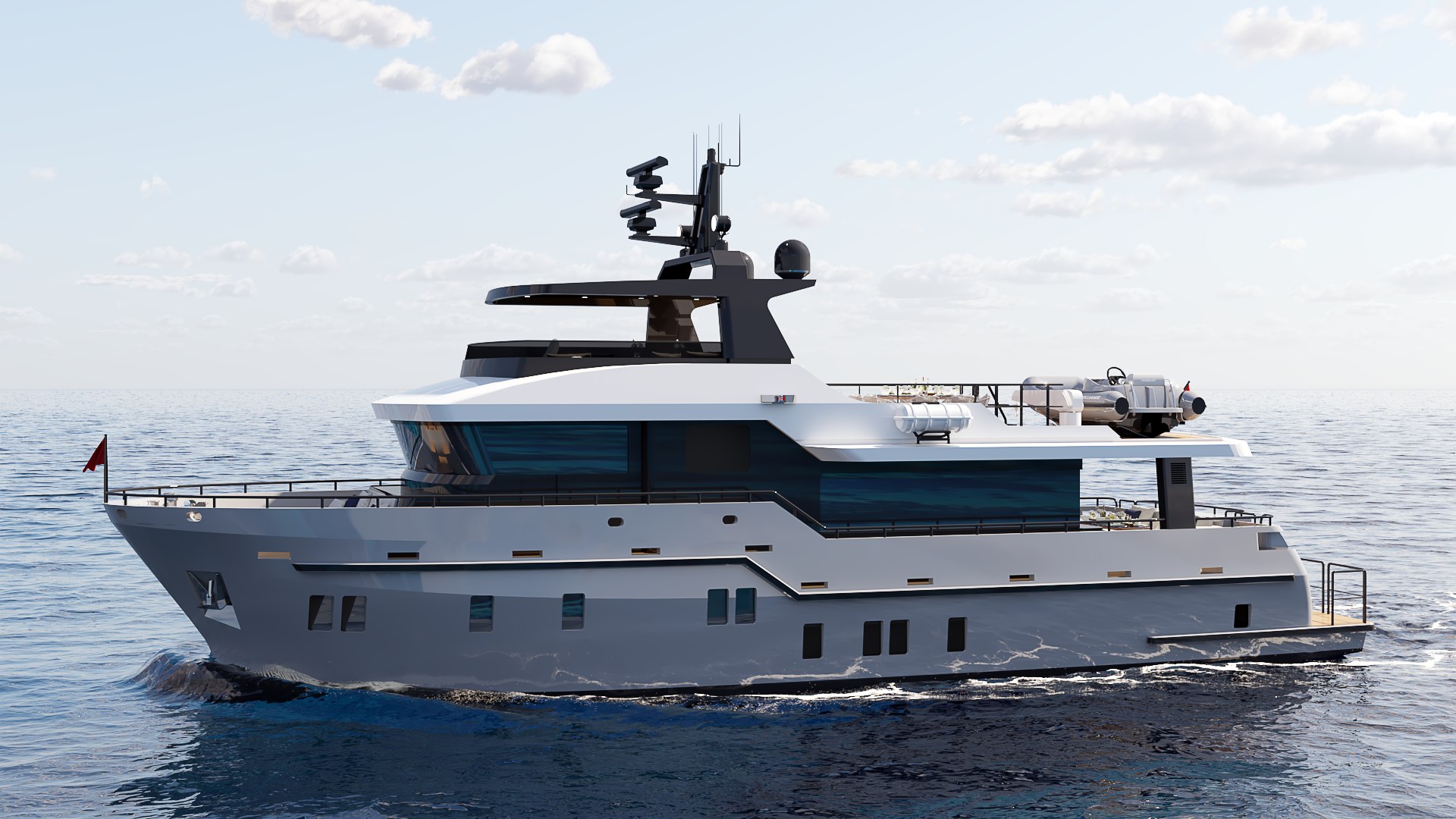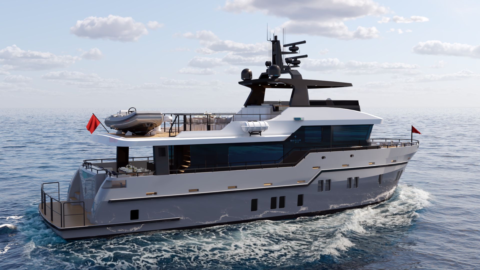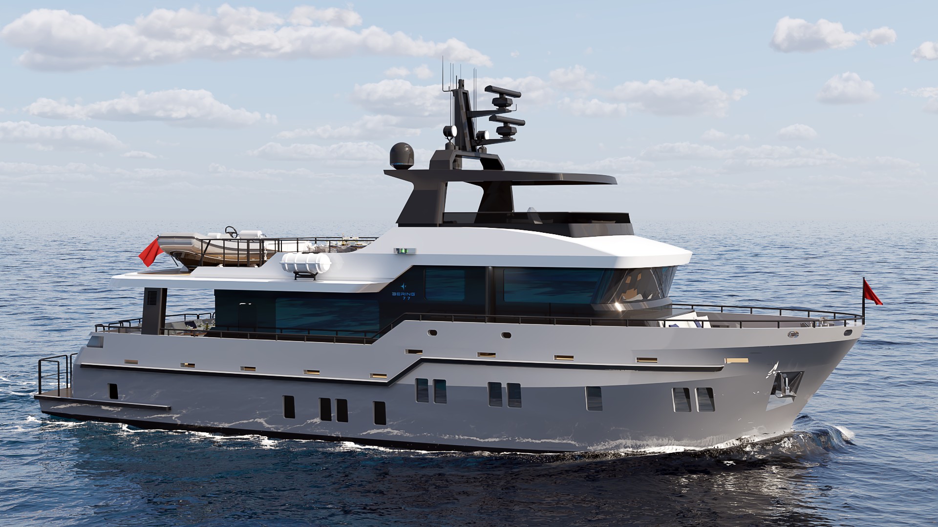 Outdoor spaces have been dramatically expanded: a generous 273 sq ft (25.4 m²) flybridge and an impressive 453 sq ft (42.1 m²) boat deck that can accommodate a large tender, creating exceptional areas for al fresco dining, lounging, and entertaining — rare at this size. Powered for super-long range (4,000+ nm), with approximately 8,162 gallons (30,900 liters) of fuel capacity, the B77 offers outstanding autonomy, extensive storage, a spacious pantry with dedicated refrigerator and freezer space, and full self-sufficiency for extended voyages. Designed for easy owner operation or optional 2-crew configuration, this compact expedition yacht combines commanding explorer presence with superyacht-level spatial intelligence — perfect for those who want serious blue-water capability without excess.